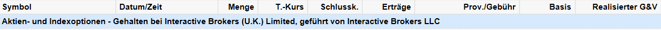 Mein großes Depot für den Handel mit Aktienoptionen bei Banx weist für den letzten Monat folgende Trades aus. Entscheidend ist hier die Spalte "Realisierter G&V" (Gewinn und Verlust). Ganz unten rechts steht das Gesamtergebnis auf Monatsbasis (gelb markiert):