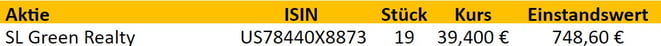 Im November habe weitere 19 Stück SL Green Realty Aktien zu je 39,40 € in mein REITs Depot für das Projekt Wohnung Nr. 9 gekauft.