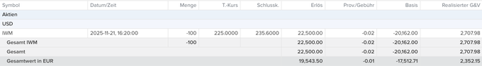 Der IWM ging mit 2.352,15 EUR Gewinn aus dem Depot. Dabei sind die unzähligen Covered Call-Prämien der letzten Jahre noch nicht berücksichtigt.