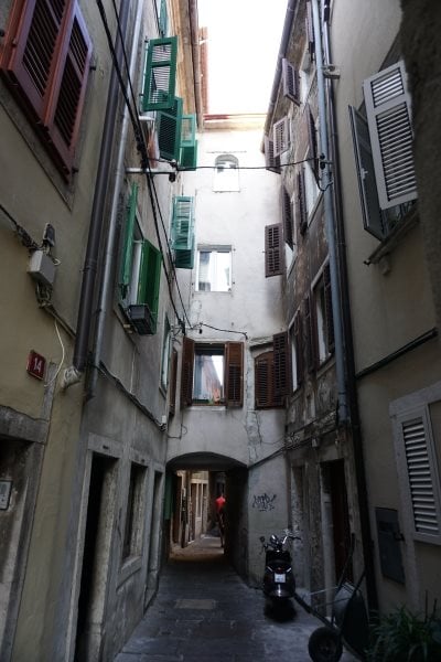 Zu Fuß oder mit dem Fahrrad ging es mehrmals Richtung Stadt (die auf einer Landzunge liegt) am Wasser entlang. Dort angekommen, kann man fernab vom Massentourismus und in aller Ruhe die engen und dunklen, allerdings sehr schönen Gässchen von Piran begehen.