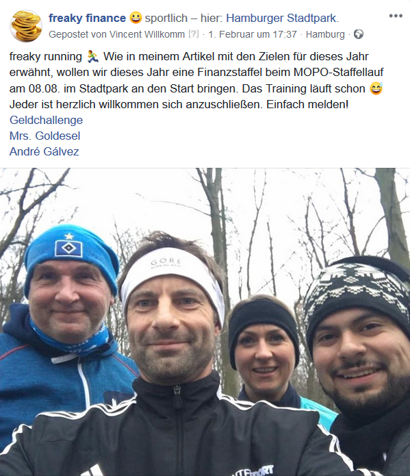 Sport lief ganz gut im Januar. Klar, der halbe Monat war mit Urlaub und gutem Wetter gesegnet, aber auch in Hamburg bei miserablem Wetter bin ich am Ball geblieben. Eine kleine Laufgruppe unter anderem mit Leuten vom Finanzstammtisch Hamburg hat sich gefunden, und in der Gruppe ist die Motivation gleich noch viel größer. Der Plan, eine Finanzstaffel beim MOPO-Staffellauf an den Start zu bringen, nimmt somit auch Formen an. Hast du Lust, dich unverbindlich den entspannten Laufrunden oder der Finanzstaffel anzuschließen? Dann melde dich gerne.