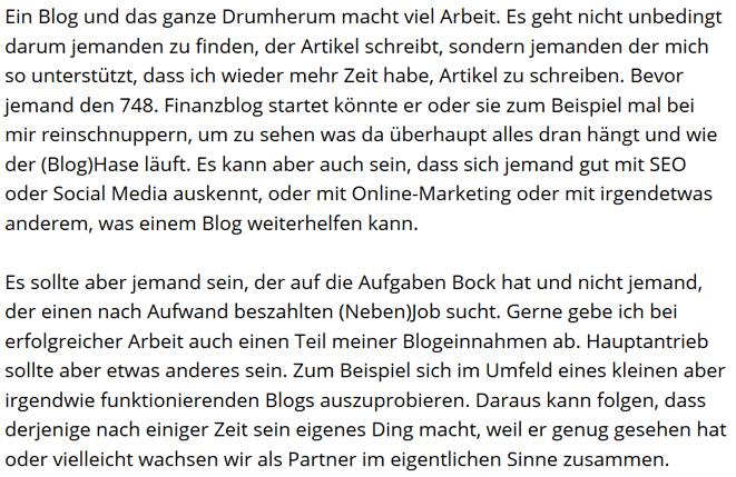 Beide sind dabei langsam einzusteigen und zukünftig jeweils ein ganz kleines Stück des Projektes voranzutreiben. Das ist schon mal super. Ich freue mich total! Eine dritte Person aus der Finanzblogszene habe ich von meiner Seite aus angesprochen und gefragt, ob Interesse besteht mich zu unterstützen. Die Reaktion war direkt positiv und wir schauen mal, was wir genau draus machen können.