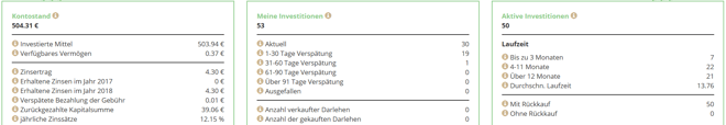 Plötzlich liegt die zu erwartende Rendite zum Laufzeitende nur noch bei 3,62% (3,44% beim letzten Update). Auch diese Rendite sinkt bei mir unaufhörlich! Grund dafür sind natürlich in Verzug geratene und ausgefallene Kredite. Beschleunigt wird der Abwärtstrend übrigens, wenn man, wie ich, dem Kreislauf kein neues Geld hinzufügt.