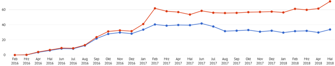 Die folgende Grafik zeigt schön, wie die Schere zwischen erwarteten (rote Linie) und tatsächlich erhaltenen Zinsen (blaue Linie) in meinem Account immer weiter auseinandergeht: