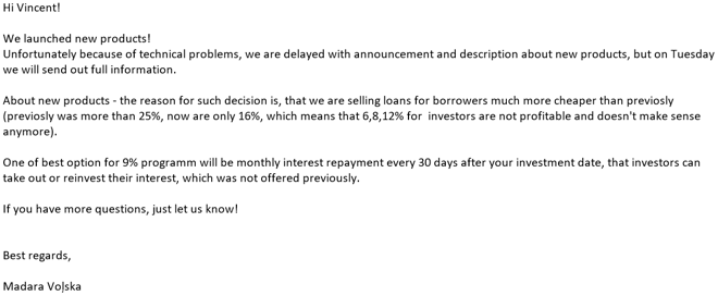 Das Geld, was ich eigentlich zu 12% bei DoFinance investieren wollte, habe ich umgehend abgezogen. Das, was in der Antwort-Mail als tolle neue Besonderheit herausgestellt wurde, interessiert mich nicht großartig, wenn ich dafür auf 3% Rendite verzichten soll.
