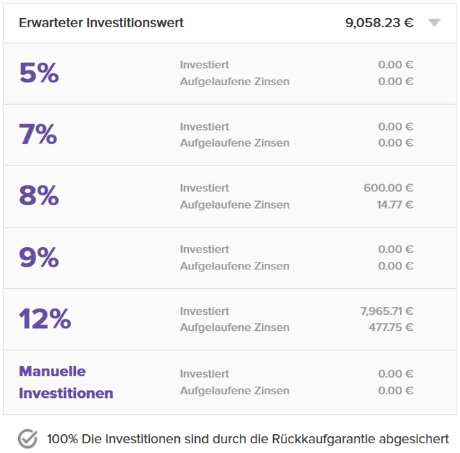Meine Rendite wird mir hier grade mit 12,04% (vorher 11,72%) angezeigt. Ich finde diesen etwas kleineren Anbieter gut, um das Plattformrisiko weiter zu diversifizieren!
