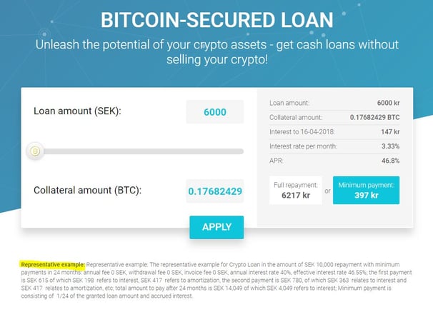 CryptoLoan verleiht Geld im Gegenwert von 50% deiner zu verpfändenden Bitcoins. Damit reden wir über ein LTV (loan-to-value) von 50. Abzunehmen sind mindestens 5.000 SEK (entspricht ca. 500€), und die Höchstgrenze liegt bei 150.000 SEK (15.000€). Das Ganze kostet den Verbraucher die Kleinigkeit von 40% Zinsen im Jahr.